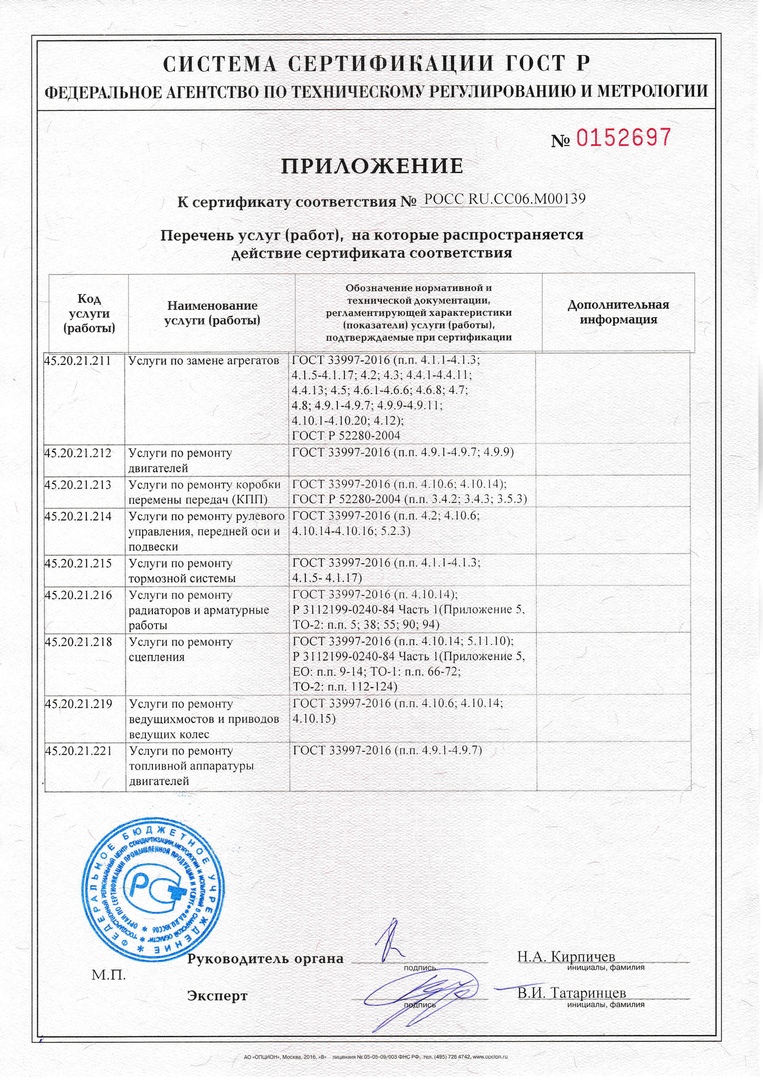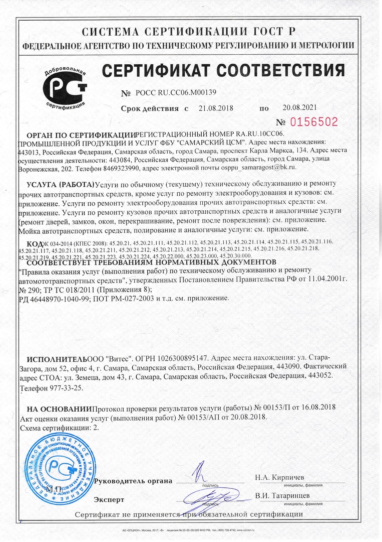 Компания "Витес" в 2018 году, пройдя аккредитацию услуг, получила сертификат качества ГОСТ. Сертификат ГОСТ - стандарт, принятый Межгосударственным советом по метрологии, стандартизации, сертификации Содружества Независимых Государств. Это означает не только преимущества при конкуренции с другими СТО, но и лояльность потребителей, а также убеждение в том, что продукция удовлетворяет их специфичным требованиям. На данный момент только 20% компаний по продаже запчастей в Самаре обладают таким сертификатом и 2 из 5 прошли проверку на соответствие своих услуг ГОСТу. По результатам оценки Экспертов ФБУ "Самарский ЦСМ" (Государственный региональный центр стандартизации, метрологии и испытаний в Самарской области), услуги, производимые компанией "Витес" соответствуют требованиям нормативных документов "Правила оказания услуг (выполнения работ) по техническому обслуживанию и ремонту автомототранспортных средств", утвержденных Постановлением Правительства РФ от 11. 04. 2001 г.